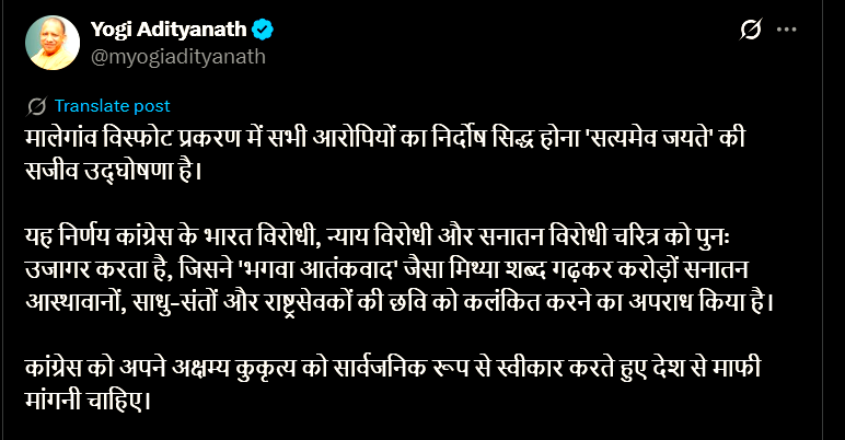 Chief Minister Yogi wrote on his social media account X on Thursday that all the accused being proved innocent in the Malegaon blast case is a living proclamation of ‘Satyamev Jayate’. This decision once again exposes the anti-India, anti-justice and anti-Sanatan character of the Congress, which has committed the crime of tarnishing the image of crores of Sanatan believers, saints and national servants by coining the false term ‘saffron terrorism’.