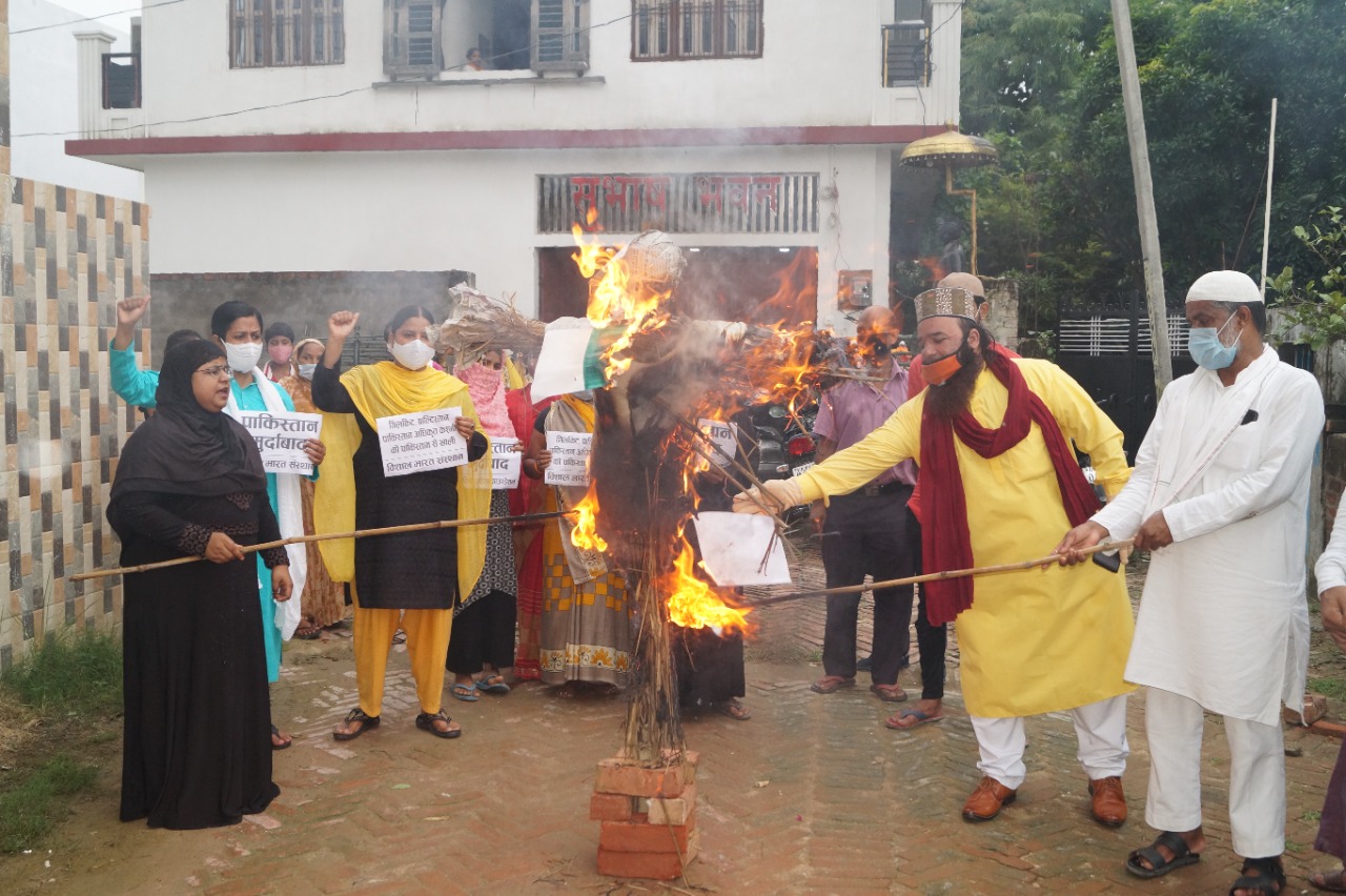 On Thursday, Muslim women under the leadership of National Sadar Nazneen Ansari of Muslim Women’s Foundation also targeted Mehbooba Mufti by burning an effigy symbolizing Pakistan in front of Subhash Bhawan located in Lamhi Indresh Nagar.